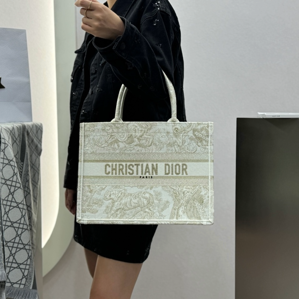 • 디올 미디엄 북 토트백 Toile de Jouy Reverse 자수 옐로우 라떼