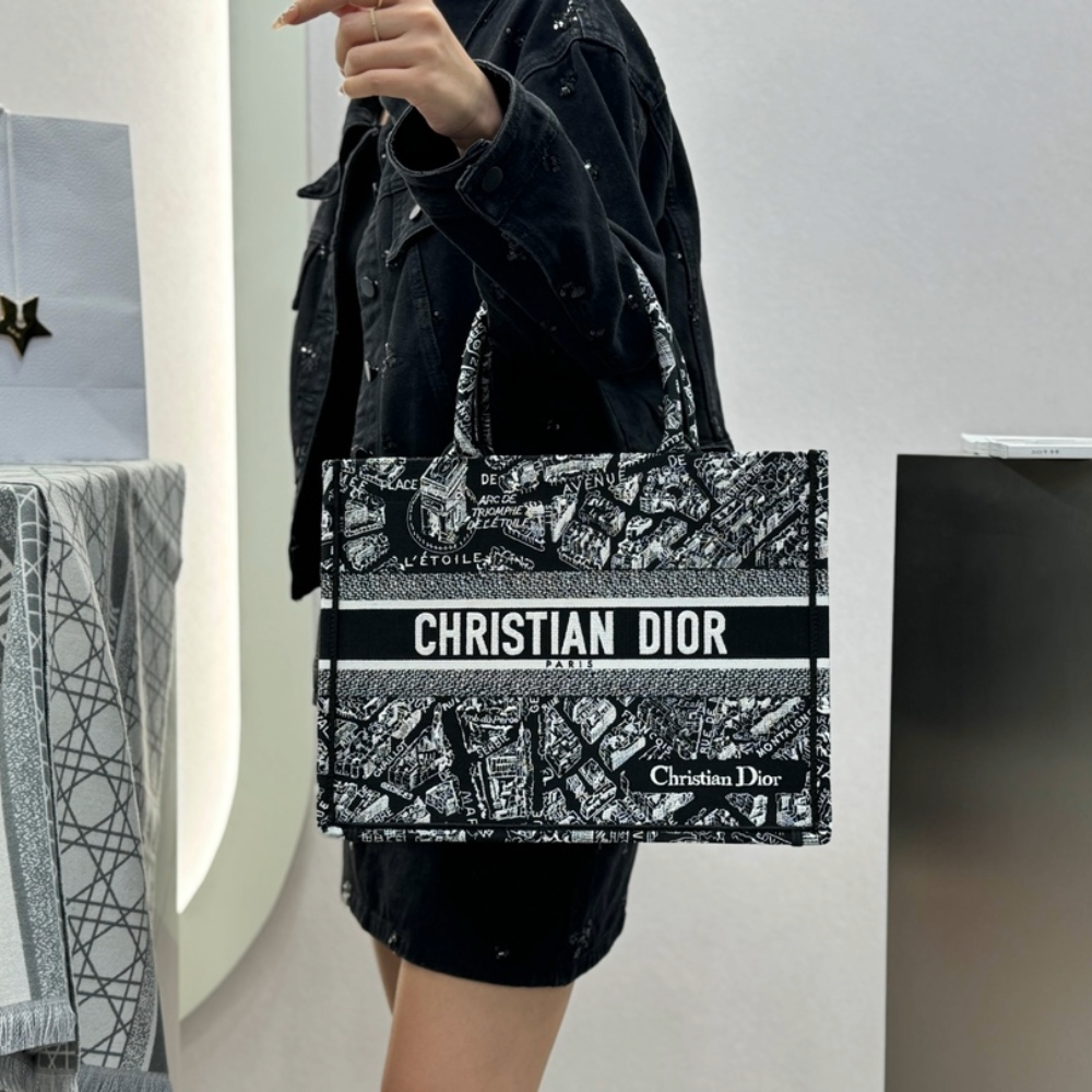 • 디올 미디엄 북 토트백 블랙 화이트 플랜 드 파리 자수