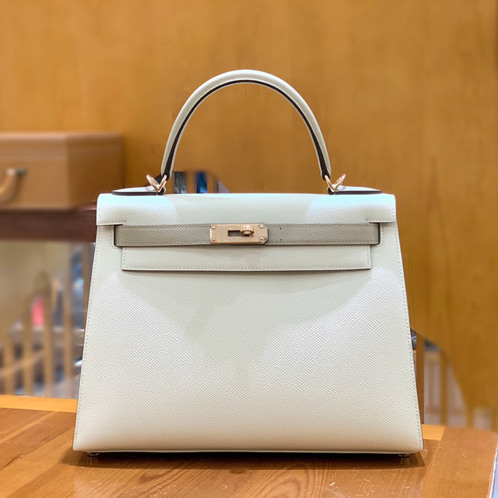 • 그린엘 에르메스 켈리 28 엡송 밀크쉐이크 화이트 & 윈드브레이커 그레이 골드 버클