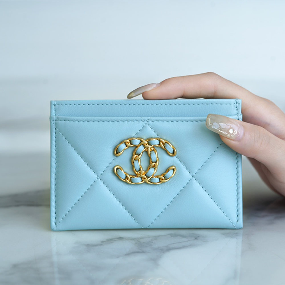 • 팬더샵 샤넬 19 카드 홀더 램스킨 & 골드 메탈 스카이 블루