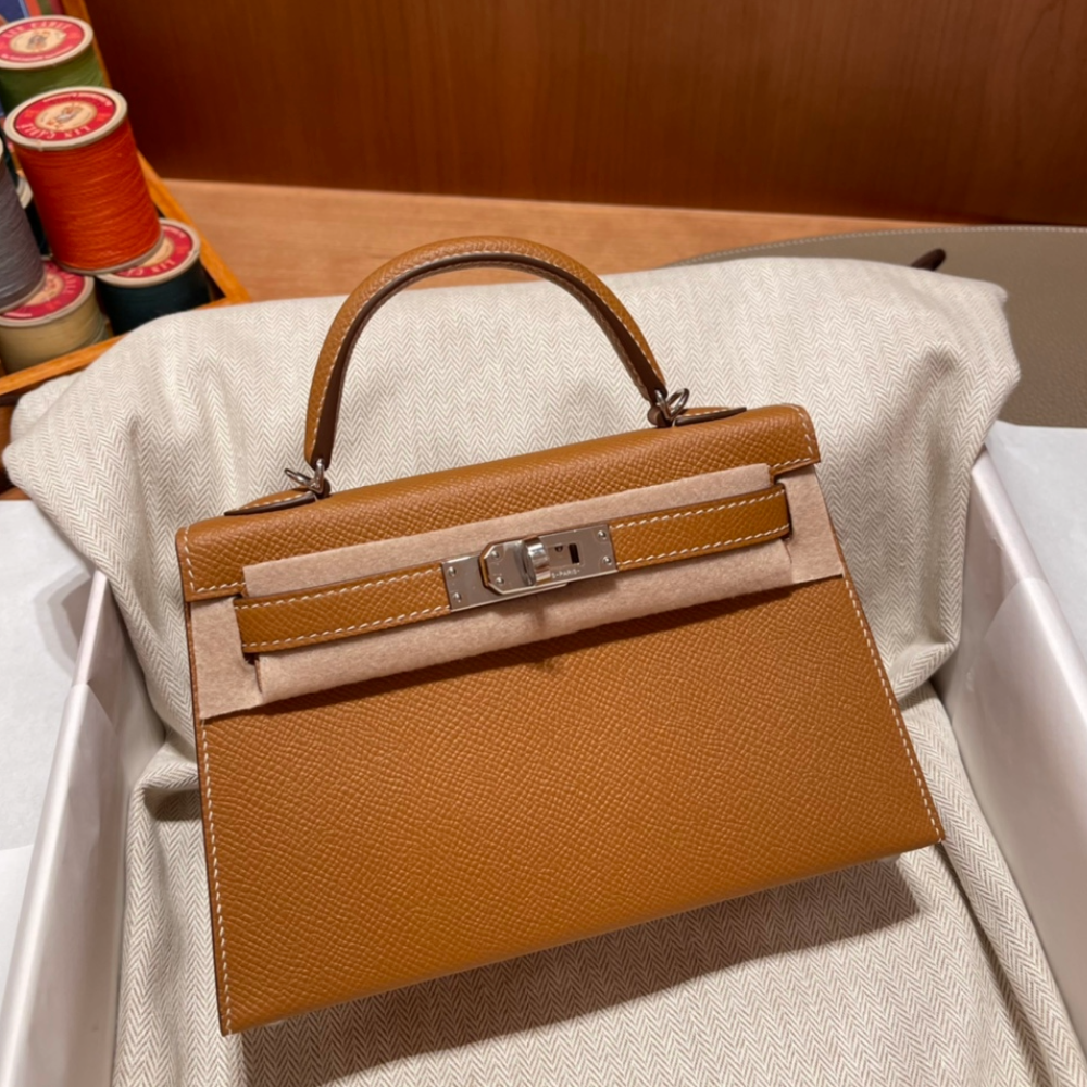 • 반수공 에르메스 미니 켈리백 골드브라운 은장 엡송