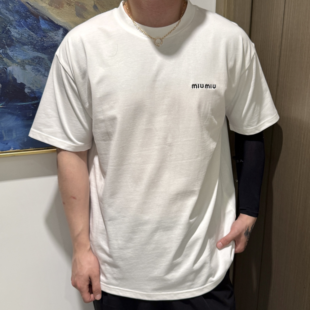 미우미우 25SS 스몰로고 자수 반팔 티셔츠 화이트 > 남성 의류